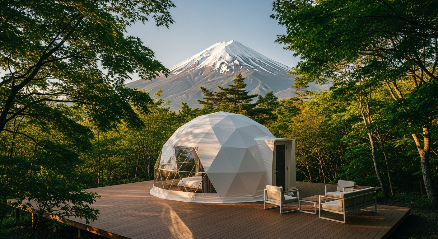 グランピングドームYOSHIMURAは、山梨県富士河口湖町に位置し、富士山の雄大な景色を間近に感じられる贅沢な宿泊施設です。ドーム型のテントは広々としており、冷暖房が完備されているため、季節を問わず快適に過ごせるのが大きな魅力です。